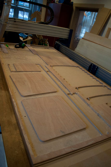 To make a test i first milled one slot for one of the connecting members from the board. This enabled me to first test this cut and leave the possibility to correct it.