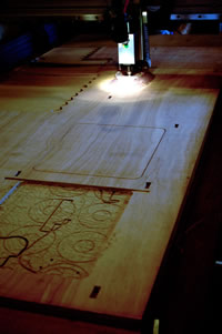 I chose this bit to minimize the splintering of the wood. Our up-cutting 1/8bits were out, so i first used a down-cut spiral bit. This gave a very nice upper-surface, but gave me some trouble on the bottom-layer of the wood. Then i found the 4-flute straight bit and this gave the best results. The top layer got a little bit more damaged than before, but the bottom layer came out a whole lot better.