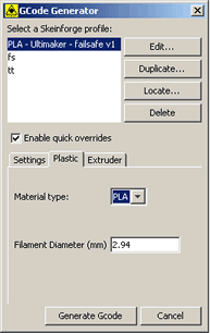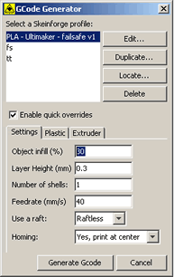 Got the adapted version of ReplicatorG from the Ultimaker Repository. This version comes preloaded with failsafe settings for skeinforge.