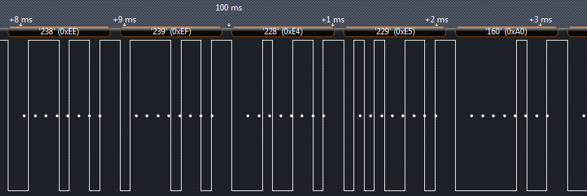 The source of this issue was located in the put_string method. This method checked if the last byte was '0x00' (termination of a string), but only after is was actually send. (see at +7ms below)