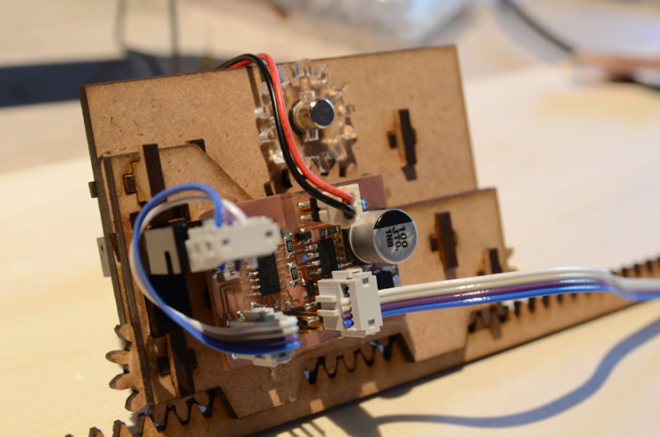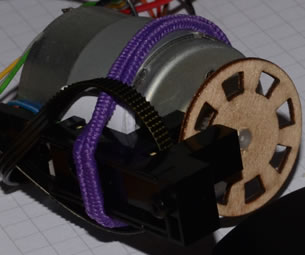 Scavanged printer parts: dc-motor, gear and toothed belt.