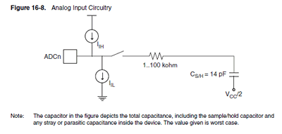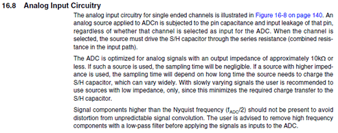 The ADC needs to charge it's 'sample and hold' capacitor. This needs to draw a certain amount of current from the system we're measuring. Too big of a resistor between the ADC and the target signal means the capacitor does not get charged fast enough, and thus giving an erroneous reading.
