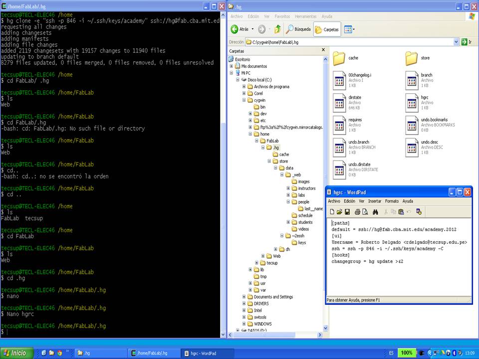 The second shows the edition of the hgrc file or mercurial configuration file and also a view of te edited file with wordpad at left.