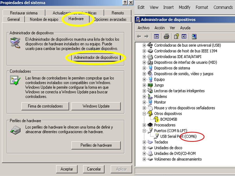 Once the program has been transferred to the microcontroller we have to establish the serial communication. I used Python programs installed in windows and ran the following command on the cmd shell: python hello.light.45.py comX, you get the X value going to the control panel in windows, double clicking the system icon and selecting the hardware tab and clicking the device manager button, as you can see in the following figure.