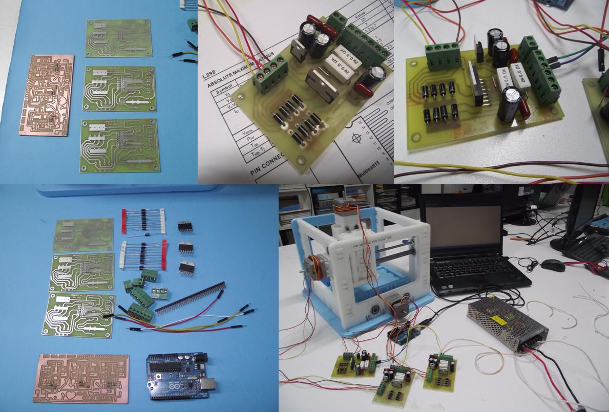 Figure 2. The boards (three boards for the L298 H bridge and one for the Arduino's shield stepper driver), the components, the boards assembled and the machine with the PC and the switching power supply.