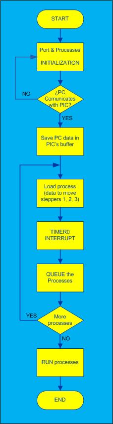 The next figure shows the block diagram (made in VISIO) of the program implemented in C to move the steppers. I'm including the code also.