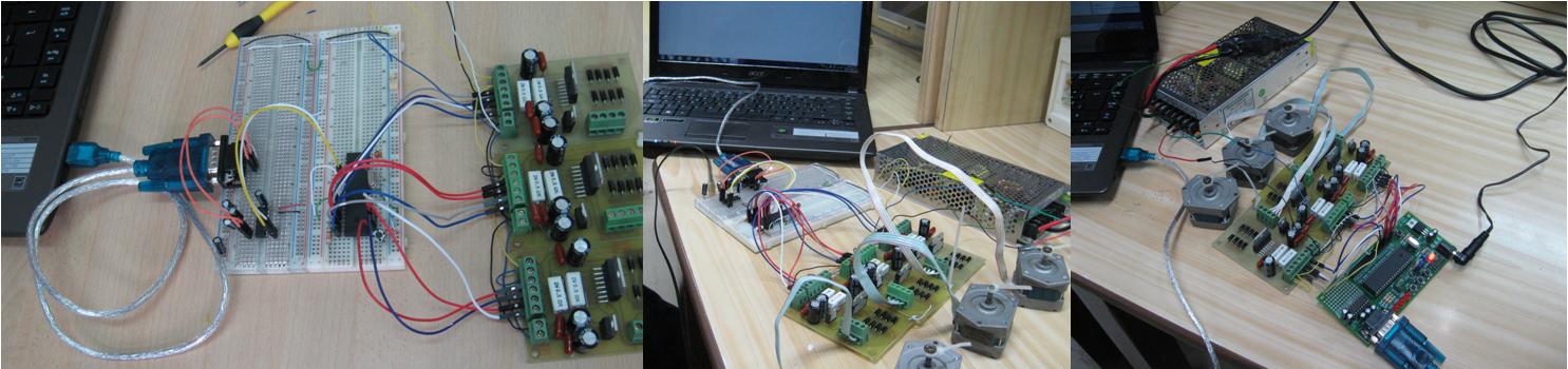 Figure 4. The picture of the left. shows the prototype of controller with a PIC 18F4550 and the H-Bridge drivers conected to the computer, in the picture of the middle is the completed system including motors, power supply and PC, in the picture at the right I used a LAB-X2 Experimenter Board for the PIC instead the of protoboard.