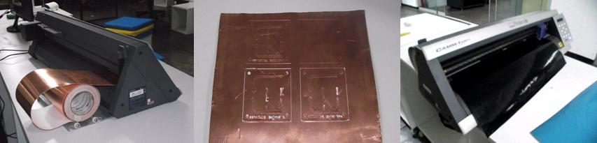 Vinyl cutter, cutting copper clad solder side and vinyl for a solder mask for the previous design. This was really a test, because I must use some film for preparing a silk screen frame. This procedure could also be use for preparing a stencil for applying solder paste to SMD |