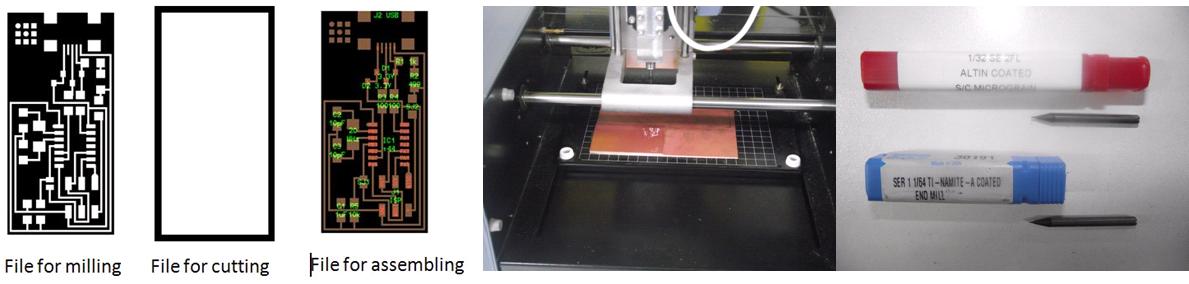 installing the board on the milling table and also the milling tool (1/32" for cutting and 1/64" for milling). Next I loaded traces file and send it to milling. Finishing with the traces i load the cutting file and place the cutting tool. This ends the board milling