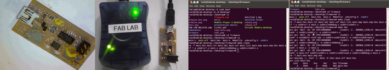 The assembled card was tested first with the AVR programmer, after a couple of tries we obtained the green light. Then following the tutorial I installed the AVR programming software and downloaded the firmware.zip file for programming the FabISP.