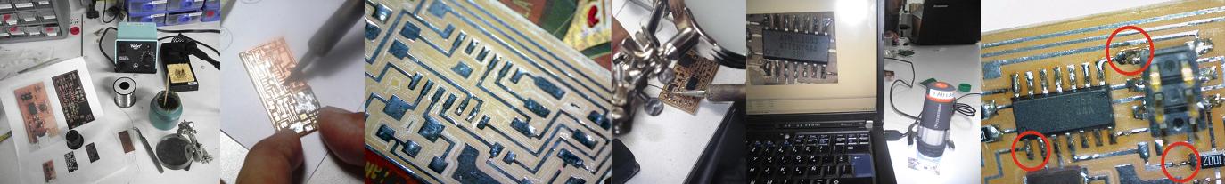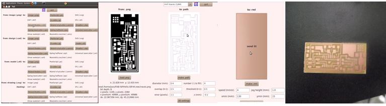 This has been a litlle board but really a hardwork, especially with milling and assembling. We had to calibrate the table of the milling machine, because some paths were milled and others not, for this we set a deep for the tool and established a closed path. When connected the ATTiny to the programmer, first we got a red light, so with the multimeter we measured the voltage supply of the ATTiny and found a short circuit, wich was fixed.