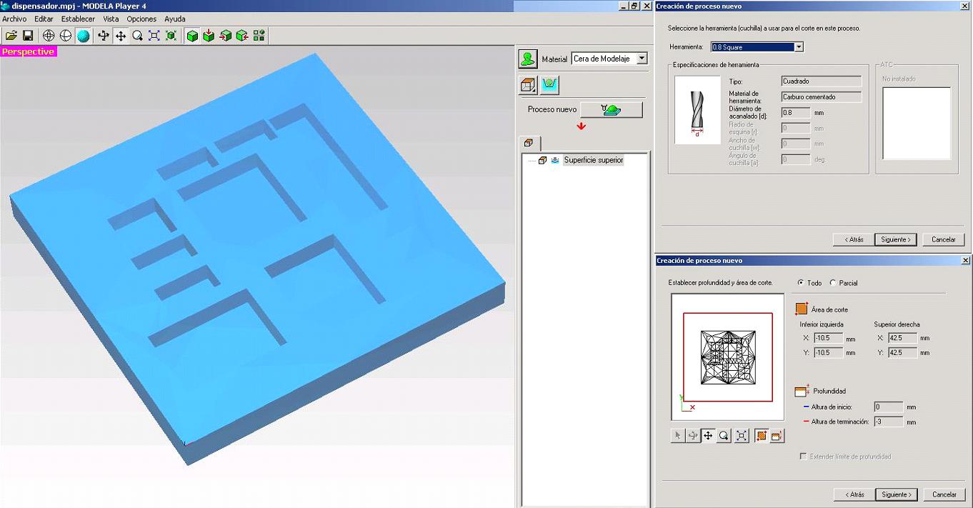 Then we mil with MDX-20, both the base of the mold and the dispenser. For the base we use a 3mm tool and for the dispenser I made a tool change to 0.8mm.
