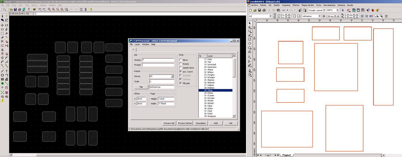 First I export, to postscript, the smd solder mask (tStop) using Eagle's Cam Processor, I considered 15 mils of clearence over the pad size, this for prevent jamming of components in the dispenser. Then open the file with Corel, redraw the space for each component and export to dxf.