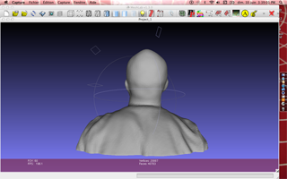 Anyway, when you have your file, you need to reconstruct your face. You clean the frame with Meshlab and Netfab for example. In my case, I had to fix a hole on the top my head. I felt like some nice doctors from Bruegel's painting had just worked on my skull. Well, now comes the 3D printing with Makerbot's famous Thing'O'Matic.