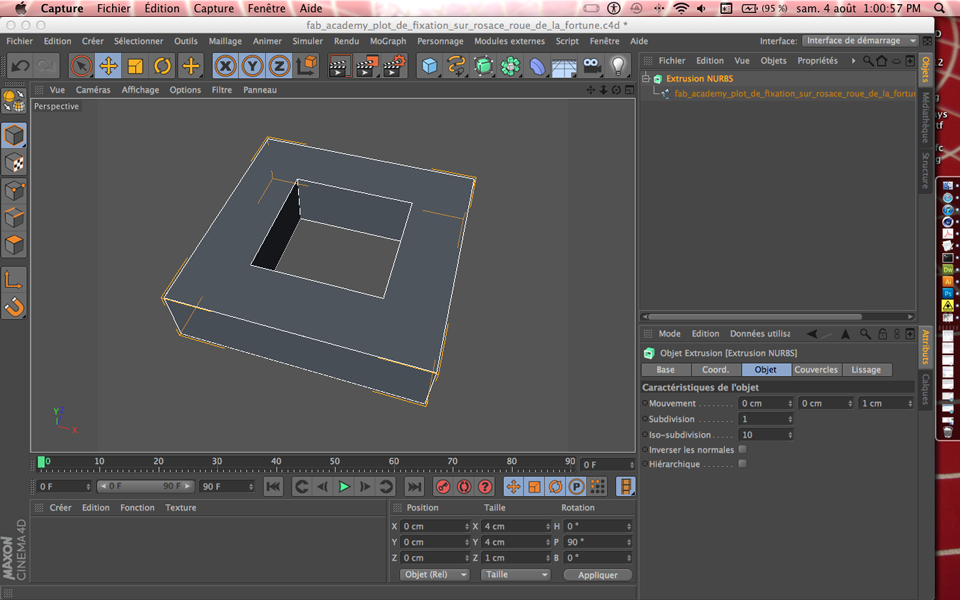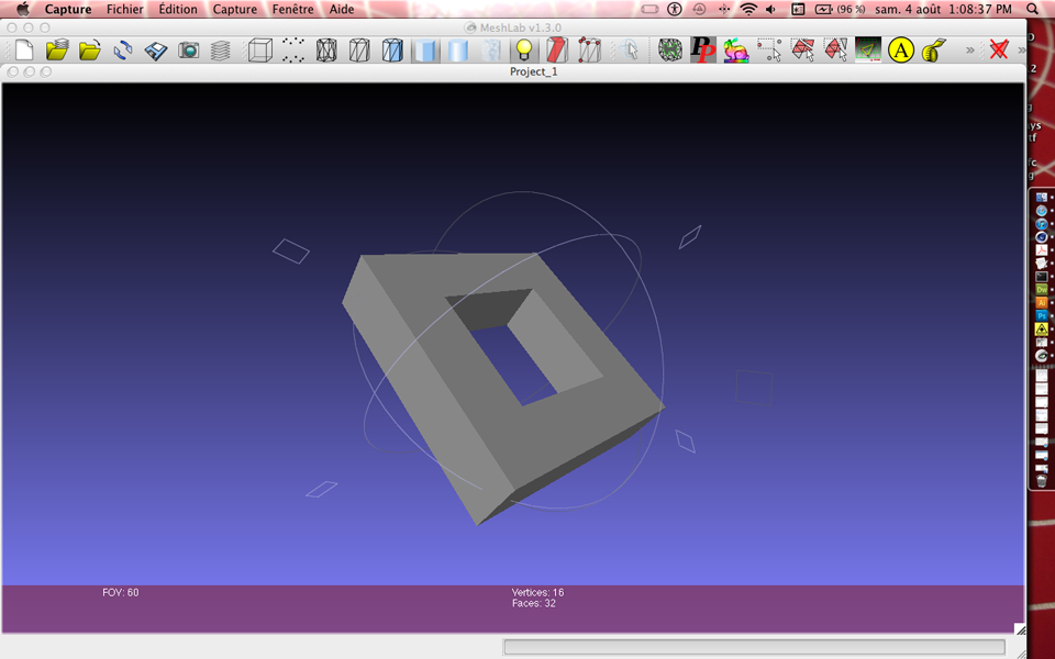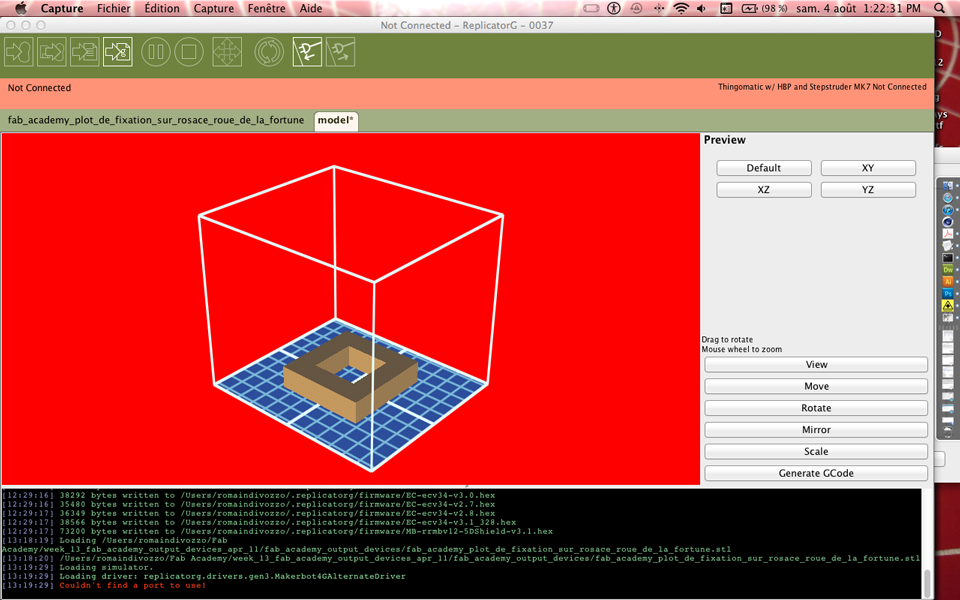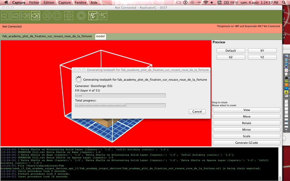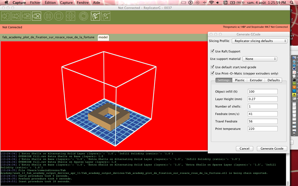 From the Replicator G software, I followed the process for 3D printing the logo (see the list below). Through the pictures below you can also see the software chain I used to make a part of my final project. I've used Photoshop to make the pattern (I made a path from the pattern and saved it as a "path to illustrator"). From there, I imported the file in C4D, I added an extrusion to it and saved it as an .stl. Then I opened the .stl in Meshlab to check it before openning it in Replicator G. In Replicator G, I defined the settings (this print is a 100 % fill) and generated the G-Code the Thing'O'Matic will use to print the object.