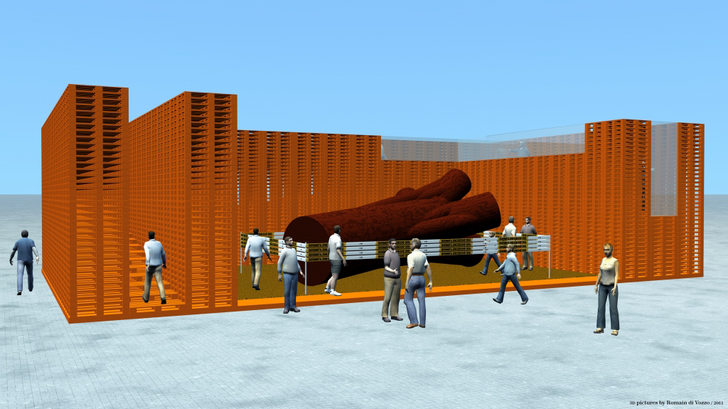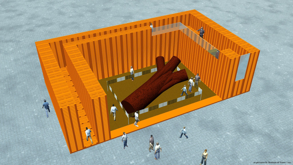 In 2009, I drew an architecture project made of wood pallets. I used Cinema 4D to build and render this designs. I would like to 3D print small pallets to build a model of this project, but it would take days and would block the access to the 3D printer for too long. Though, I designed a press-fit fragmented pallet model to make a clean 3D print of it on the Thing'O'Matic. I should probably refine my design and print it bigger. I kept the holes closed to make a kind of press-kit but the printing failed.