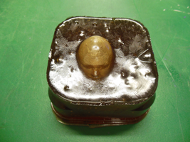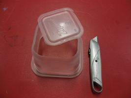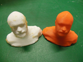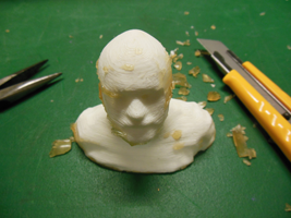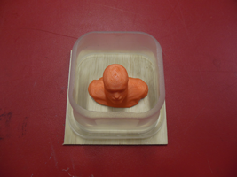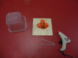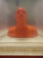 Later, I also made a mold from the 3d printed sample of my face. It doesn't require a lot of skills and you only need a few material : 1 glue gun, 1 cutter, 1 piece of flat wood, 1 plastic box you can cut (from the trash) and the object you want to copy. Here I've used a 3D print auto-portrait. You also need a spray to avoid any oversticking issue between the object and the mold. I forgot to use it, and it made the demolding a little more complicated. I didn't want to use more than 1 bottle of resine and I kinf of ran out of resine. But it's ok, with a little bit of tinkering, I ended with a working mold. You can the details of the 3D print on the mold on the pictures below.