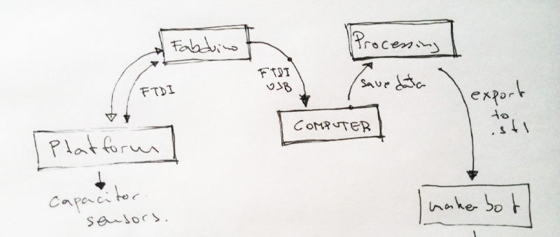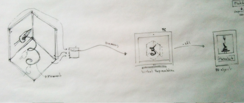 Based on Kyle McDonald's project called 'DIY 3D controler'. My final draft is to make an interface 3d capable of capturing the movements of the hand and/or stylus, in order to draw the object in space directly in three dimensions. So that it draws a line in space as you go by defining the path of your movements. Finally, this line could be exported to a file '.stl' to be printed in a 3D printer directly.