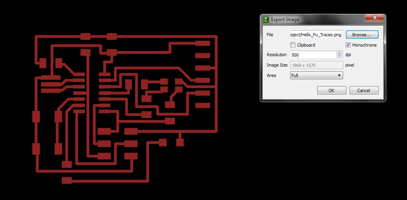 After the schematic and board, image export, Eagle has a menu option to "export", selected as a image, monochrome, and 500 DPI.