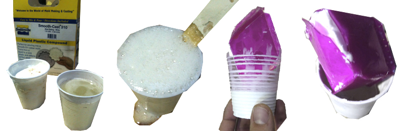 For the first test I used the "Smooth Cast 300 Series" of liquid plastics resine. This material is composed of two components and the proportions of the mixture are 1 to 1.
