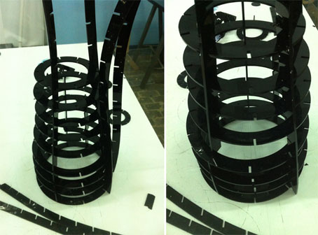 3mm black acrylic _In this first test the geometry was to extreme and I model the surface in rhino and use a command called sweep 2 rails, using this one you get a very nice shape but then it is difficult to make it work unless you 3d printed.