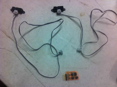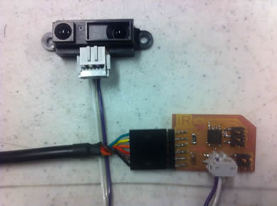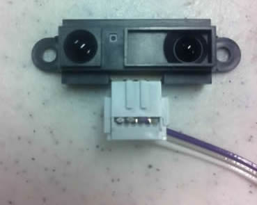 For my input device I decided to repurpose 2 Sharp 2Y0A21 IR distance measuring sensor units. The unit sends an infrared signal out and measures the time it takes to bounce back to its IR receiver. It translates this time to an analog output 0-5V. The sensors are designed to work within the range of 10cm-80cm.