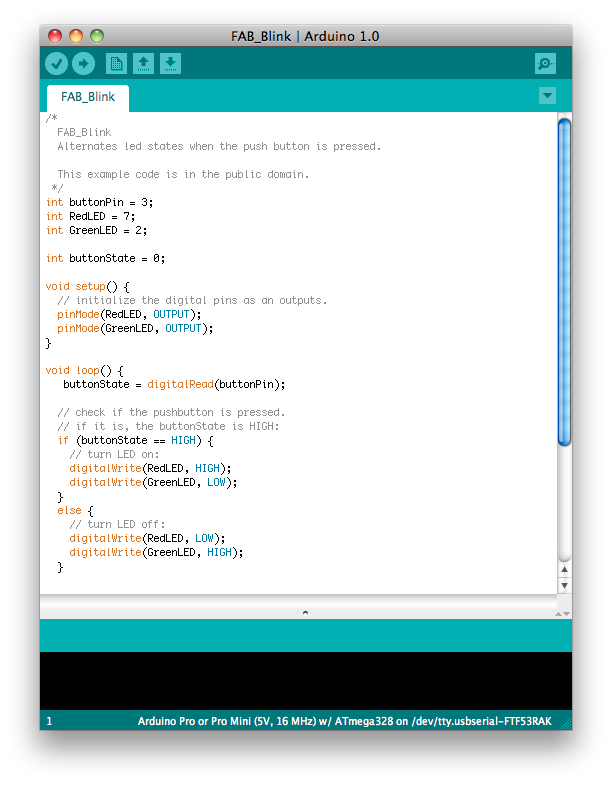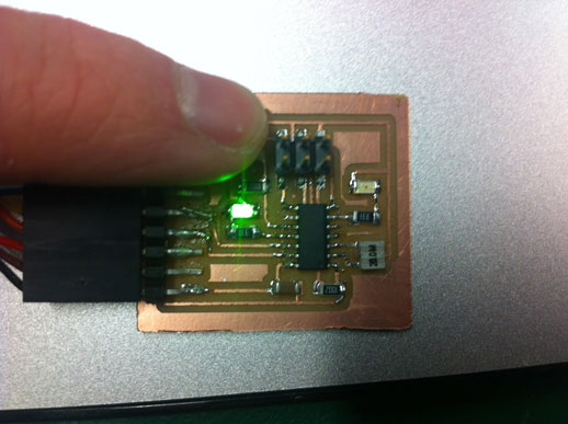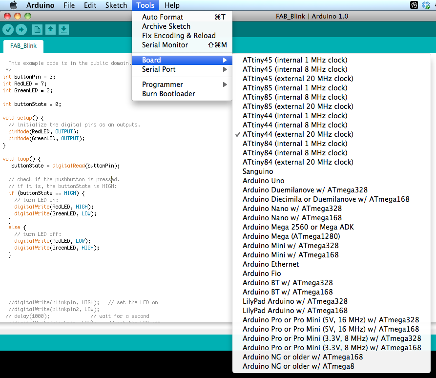 Taking the board I milled and stuffed from week 7, I programmed it for this weeks assignment. This was fairly straightforward, here's my procedure. Using the Arduino 1.0 programming software to program my board I needed to add the ATtiny support files to allow the software to connect to the Attiny44. The files are located here: