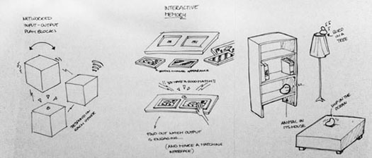 The first assignment is to come up with a potential personal project, that can function as an umbrella for the various assignments. My project will be about tangible interactive objects that trigger playful exploration and storytelling. I have always been interested in bridging the virtual and physical world by means of tangible interactive objects, so I would like to play around with this theme. During the weekly class assignments I plan to make a series of small and open ended rapid prototypes. I want to start making simple blocks that do 'something'. Later I can make objects that respond to the context they are in. See a sketch of three ideas below. These separate experiments together will give me input for a cool final project in which I combine what I learned throughout the course.
