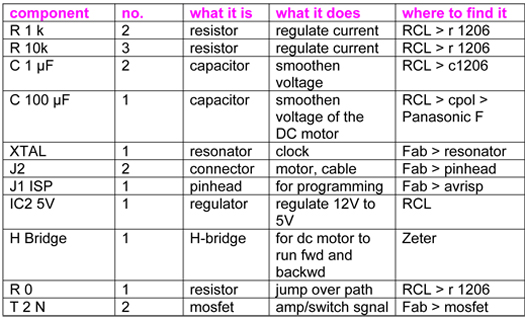 When the schematic was done the parts had to be organized on the board. The easiest way was to follow the example DC motor board layout as much as possible and then organize the other components afterwards. With the components more or less in place you can start doing the paths. Select the wire button, click a pad and draw a line to the next pad. The yellow air wires show you where to go. A trick for organizing the parts: click 'ratsnest' every now and then. It tells you the shortest connection between the other components. Thickness of the wires should be +/- 0.016, and the wires from the moter to VCC and GND somewhat thicker. Use the layer tool to adjust the visibility of the name, origin and value layers, if that makes it easier to drag around the parts.