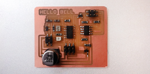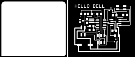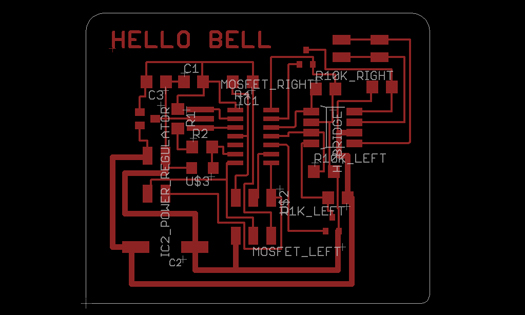 Finally do a Design Rule Check. Open the drc dialogue to adjust the settings for your board and milling bit. The clearance should be 16 mil, which is the size of the tracing bit. Set copper/dimension to 1 and run the check. It will show a lits of all the parts that can not be milled correctly. Solve the issues by moving components, wires, and if that doesn't help make the wire slightly thinner so the milling bit can pass. In the end the hello_bell board layout looked like this: