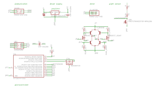 First of all the right parts had to be imported in the schematic with the 'add' function. We took all the components from the hello light board, but left out the attiny, J1 ISP and the FTDI cable. From the hello h-bridge board we took all the components, but left out the J1ISP, and J3. We ad
