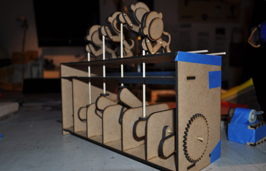A dc motor drives the automata. The motor is attached to the first rod on one side, and since all the parts are connected it will make all the cams rotate.