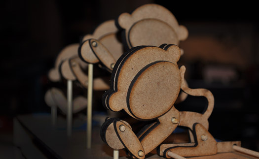 First we watched lots of videos to find out how to translate the motion. Then we made some prototypes out of cardboard to determine the size and lengths of the cams, the distance between the parts, and the lengths of the sticks and the amplitude of the monkeys.