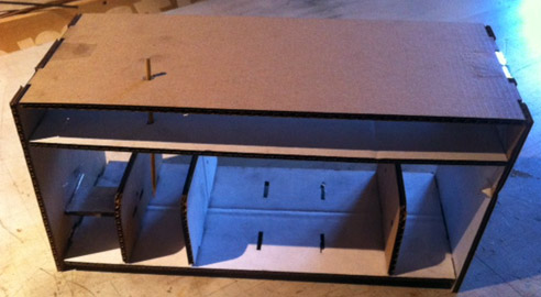 When we had the desired construction in cardboard we finalized the drawings in illustrator and cut the parts with the lasercutter. We worked with 3 mm mdf. Sometimes the connections are snug in the beginning but when you put the thing together many times the pressfit becomes loose again.