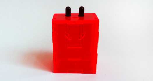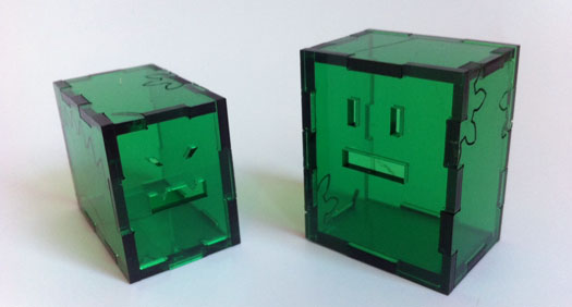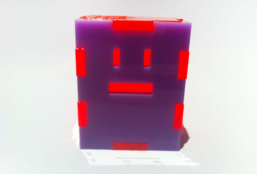 I made a toy-kit from waste acrylic sheets consisting of rectangular pieces, that you can connect together to make a little cube shaped puppet. People can play with the colours and the different faces. The pieces are cut out of left-over pieces that had engravings from other people in it, so each side is different.