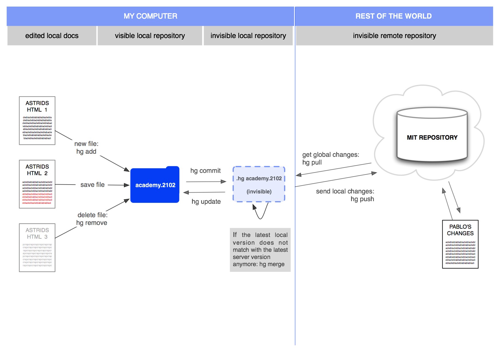 In the meantime we have been struggeling a lot with Mercurial. I still find it difficult to imagine how it works and what it does - it is not very intuitive to me. Therefore I made a little drawing to remember what the commands actually do.