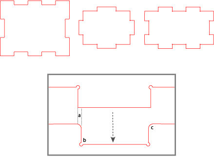 The sides of the cube stay together because the pieces are squeezed tightly into each other. The overlap between the pieces that fit into each other was 0,2 mm for the material I used. Since the lasercutter also cuts away 0,1 mm each line, I needed to draw an overlap of 0,4 in my illustrator file. So the distance a in the image below is 0,2 mm. To avoid tension concentration the inside corners needed a little hole at the corners. See b in the image below. The outside corners c of the openings need to be filleted, to help align the piece that slides into it.