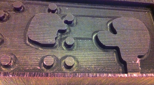 After roughing, finishing and releasing the block I saw I had overlooked something. On the right side of the mould there are supposed to be holes that will be pins in silicone for the alignment of the two halves. To solve this in a quick-and-dirty way, I mirrored the center points of the pegs and carefully drilled holes on the right halve.