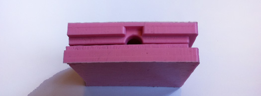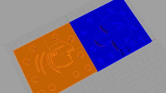 First create the object as you would like to have it- I did mine in Rhino. It is important to think which bit you will use for milling the was, because the holes and corners of the design can never be narrower than the size of the bit. Also it is important to take into account that smaller bits have shorter shafts, so they can't go deeper than the length of the bit - otherwise the collet can damage the top part of the wax when it moves down. When the design is finished split the two halves, mirror one half and put them next to each other. Then design the pegs and the holes for alignment of the silicone mold. Round the corners of the holes in the model: they will be pegs later on and they fit better if they are rounded at the tip.