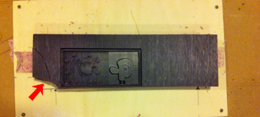 Time to place the wax block on the bed of the shopbot. The block should be attached to a flat piece of wood with double sided tape and screws. The wax breaks easily, so be careful whith the screws (see red arrow in the image above). Always indicate where the screws are inside the wax, because the milling bit should never be able to accidentaly hit them. I zeroed the x, y axis a bit beyond the position of the screws and in PartWorks I entered smaller width and lenght than the actual size of the wax block, so the milling bit would not go near the screws.