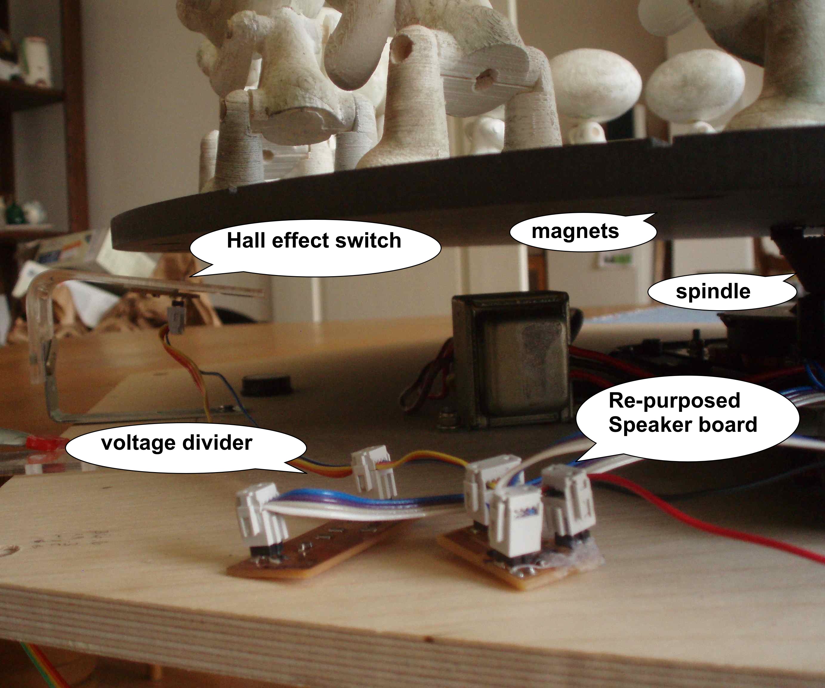The spindle is from an old Sony turntable. These old turntables have a magnetic strip painted around the rim under the platter, which is read by a tape head, this is how the turntable achieve speed control. This was no help to me, the Zoetrope speed is controlled using a Voltage divider.