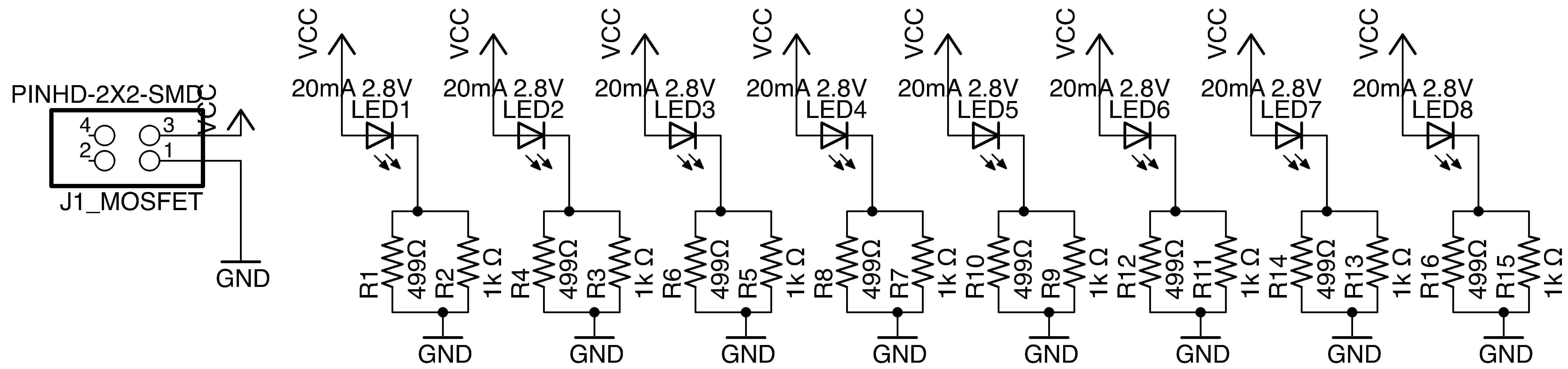 The bright white LEDs each need 20 mA constant current, and a forward drop voltage of 2.8V (found in the LED datasheet).