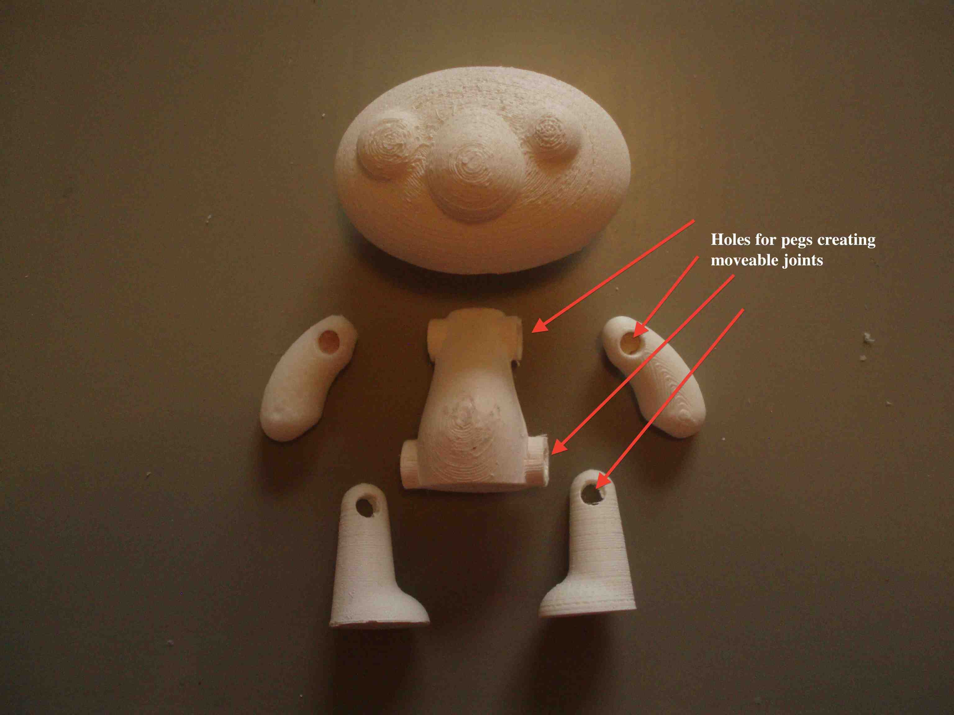 The character was design in Rhino 3D. The head, arms, and legs are jointed and moveable.