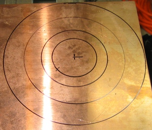 I wanted the structure of the lamp to have a somewhat organic look. I decided to make the lamp look like a large mushroom and the three sensors like smaller mushrooms growing around the base. To form the large mushroom cap I started with a sheet of .032" thick annealed copper sheet. I marked the center of the sheet and drew an eight inch diameter circle on it with a compass. I then drew three more concentric circles each about 1" smaller than the last. These smaller circles are reference lines to help during the raising process.