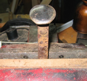 With the burrs removed and the edge smooth I was ready to start the raising process. Raising is a method of metal working in which a piece of sheet metal is formed by repeatedly hammering it over a stake or other form. For my stake I used an old railroad spike that I had cleaned and polished the top of. I put the spike into my bench vise and secured it in place.