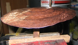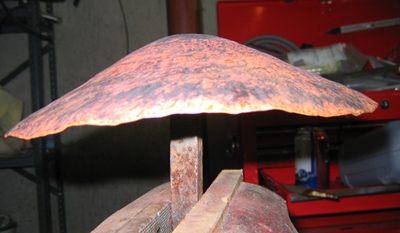 Annealing is a process of heating and cooling that alters the metals structure and makes it more ductile. To anneal my piece I heated it with an acetylene torch until it was glowing orange. You want to keep the torch moving on the piece to make sure it is heated evenly. Once you reach a consistent orange glow you can remove the heat and let the piece cool or you can quench it in water. For the sake of time I put my piece into a five gallon bucket of water. The annealing process although simple is dangerous. Be sure you wear proper protective gear and work in a well ventilated area. Once the piece is annealed its back to the stake for another round of hammering. Hammer, anneal, hammer,anneal again. Continue until you get the shape you want. For my large mushroom it took four to five cycles, and three to four hours from start to finish. The finished cap looked like this.