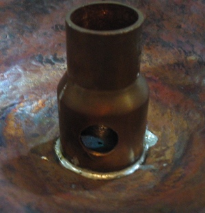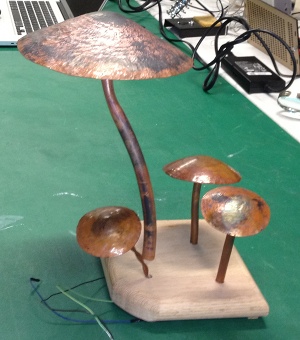 After raising the large cap I repeated the same process three more times using 3 1/2" to 4" discs to make the caps for my sensors. With the caps done it was on to the stems. For my large cap I used 1/2" m type copper pipe to form the stem. All I did was anneal the tube so it would be easy to bend and bent a nice curve in it by hand. For the smaller mushrooms I used 1/4" tube so it would look proportional. To attach the stems to the caps I cleaned a small area on the underside of the cap with fine sand paper. I applied paste flux to the clean spot, heated it with the torch and melted a pool of solder onto it. Then I placed the stem on the solder pool and reflowed the solder while holding the stem in place. On the large mushroom I didn't solder the stem directly to the cap. Instead I soldered a 3/4" X 1/2" reducer coupling that I predrilled 2 holes into the side of to the cap. The stem slides into the small side of the reducer allowing me to split the two parts for wiring.