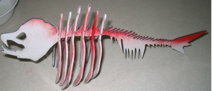 This weeks assignment was to create a press fit construction, cut it on the laser cutter and assemble it. Coming up with an idea for this project took me a while. I wanted to make something creative, not just a simple box. I finally came up with the idea of making a fish skeleton. The skeleton consists of seven parts. The first Piece is The skull,backbone and tail. The remaining pieces are ribs,2 each in three different sizes. I created the design in Inkscape. My first design attempt was a miserable failure. I simply could not draw the skull/backbone piece and have it look like a fish. It looked more like a deranged lizard or something. After scrapping design one, I found an image of a fish skeleton clip art on line. Fish clip art I imported the clip art into Inkscape and set it as layer 1. I then created layer 2 and traced the basic shape using the bezier curve tool. This allowed me to pick points on the clip art and draw straight lines and curves to quickly develop my fish. After getting the basic shape down, I turned of layer 1 and tweaked my design to adjust the size and add the notches for my joints. To make the notches I drew the first one and then cloned it to make the rest of them. I thought this would make adjusting the notch size easier when I went to cut with the laser. Although it did reduce the number of steps to adjust all of my notches it also lead to some other problems. When I tried to adjust the spacing and layout of my parts the clone drove me crazy. I needed to rotate my parts at different angles to fit them all on the sheet. When I rotated the part with the original notch all of my clones would rotate too. I would then have to go back and rotate the clones back to their original positions. Adjusting the notches had some other minor issues too. After I re-sized, them I had to individually edit all of the lines that intersected with them. Not a difficult task but a bit time consuming. Finished Design Once I had my design set I created a test cut file. Test Fit It was basically 2 1" squares with my notches on them. By running this test cut on the laser I was able to quickly adjust my notch size to get the friction fit I wanted. After 3 or 4 tests I was satisfied with the fit and ready to cut. I went back to my design and adjusted the dimensions of the notches. When I brought the design into Corell Draw and set the line width to a hairline I noticed another big mistake. The laser cuts lines drawn as .001" or a "hairline". My original fish was drawn with a stroke width of .010". When I brought the design (with all of my notches nicely adjusted) into Corell Draw and changed them to a "hairline" it compressed all of my dimensions. This threw all of my notches out of whack and sent me back to inkscape for another round of editing. Luckily I noticed the problem before I cut my design. After making final adjustments to my fish it was time to cut. I put a 12" x 24" piece of 1/8" masonite into the laser cutter loaded my design and printed it. Everything seemed to go well, the notches were all there, charring was minimal etc. Everything seemed to go well, that is, until I removed my stock from the laser cutter. Some of my parts didn't cut all the way through. The penetration of the laser was a bit variable. Lots of people in the lab had been having the same problem so it wasn't a total surprise. The bed of the laser cutter is a bit wonky and we are waiting for a replacement. I think the differences in the height of the bed are throwing off the focus of the laser beam and wreaking havoc. Although my parts didn't pop right out, I was able to free most of them with a little effort. The edges were a bit ragged but the fit of the joints was pretty good. I tried a second run with adjusted settings( lower speed , more power and higher frequency). The penetration was better,still not perfect, but the edges were more charred. The parts came out of the stock a little easier but the joints were sloppier. Once the bed of the laser cutter gets straightened out I will take another shot at it. To finish off my fish I added a quick coat of white spray paint and a dusting of red for contrast. I think it looks pretty damn good. Now I want to make about ten more so I can have a whole school of fish bones.