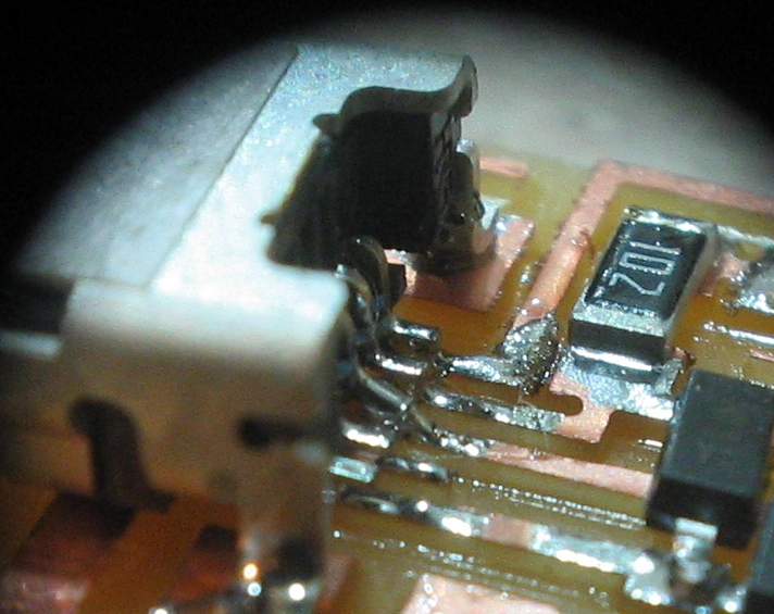 This weeks assignment was to mill the board for the Fab ISP, solder on the components and program the board. To mill the board I used the Roland Modela cnc mill. I opened the file and loaded it. Put a 1/64" end mill in the spindle and ran the file to mill the traces. After sucussfully milling the traces I changed the bit to a 1/32" end mill and cut out the board. The milling process was smooth like butta and I was ready for solder. Before soldering any components to my board I put paste flux onto all of the solder pads with a Q-tip. I tinned the first pad for my IC positioned it so all the legs lined up with the pads and soldered it in place. After soldering all the legs of the IC, I moved on to the other components. I used the same process of tinning one pad and fixturing the component the soldering the other pads. I did all of the resistors, then the caps, diodes and then the crystal osilator. I soldered all of the small components then moved on to the six pin header and finished with the mini USB connector. The soldering process went pretty smoothly, the only component that gave me trouble was the mini usb. I soldered the pins first and then the mounting pads. I should have done it in reverse so the connector would have been fixtured better before I soldered the pins. After I completed the soldering it was time to program the IC. I plugged the board into the usb port and passed the "smoke test". I connected to a USBtiny programmer the make file was already edited so I didn"t have to mess with it. I typed "make clean" and got a successful response. Next I typed "make hex" and again was successful. I contiued with "sudo make fuse" and "sudo make program" again no errors. With the programming complete I disconnected the USBtiny and plugged my FabISP into the computer to see if it recognized it. It did not. I started looking around on my board to see if I could find any issues. With the naked eye everthing looked fine. I then looked at it with a magnifying lens I scavenged from a flat bed scanner. I concentrated my search to the mini USB because that was where I had the most trouble soldering. I found that my ground pin was floating above the board and not connected. To document the problem I taped my magnifier to my camera lens and was able to take a decent picture.
