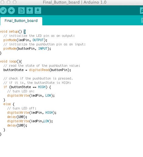 This weeks assignment is to program the hello button board in as many languages as you can. I programmed the board using the Arduino IDE. I opened the Button sketch from the examples menu and changed the pin designations to match the pins on the "Hello Button" board. The "buttonpin" changed from pin 2 to pin 3 and the "ledpin" changed from pin 13 to pin 7. I then selected the ATtiny44 (external 20 MHz clock) from the board menu. I selected the USBtinyISP programmer from the tools menu and uploaded the sketch to my board. When the sketch was "Done uploading" the led on the board lit up. When I pushed the button it turned off. In an effort to make the board a little more exciting I modified the sketch and initially set the ledpin low. Then made it go high when the button was pushed. Yeah it worked but still not very exciting. Blinking led's are way more exciting so I decided to make it blink. After setting the ledpin high I added a delay of 1000 ms. Then I set the ledpin low and added another 1000 ms delay. I uploaded the new sketch and it was still not very exciting. In a last ditch effort to make myself say "wooow!" I reduced the delays to 100 ms. Uploaded the sketch again and now when I press the button my led flashes quickly instead of the slow boring blink. I think that is about as exciting as it is going to get. This is my Final sketch and it is way more exciting than just a button that turns on an led.